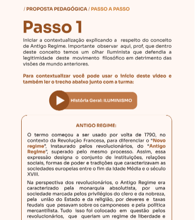 Você encontrará propostas sobre Iluminismo, Revolução Industrial, Revolução Francesa, Independência das Américas, Imperialismo, Abolicionismo, República no Brasil e outros temas essenciais — sempre com documentos históricos, problematizações guiadas e sugestões práticas para aplicar em sala.